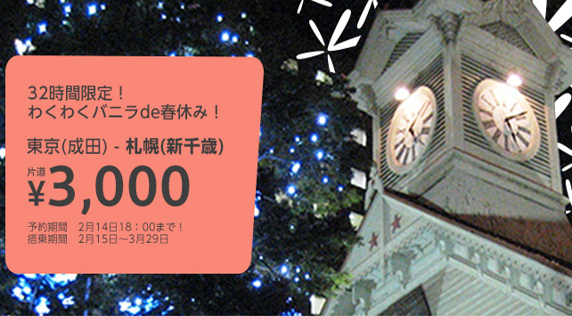 バニラエアは、東京/成田〜札幌/千歳線を対象に、特別運賃「わくわくバニラ」を、2014年2月14日午後6時までの32時間限定で発売している。