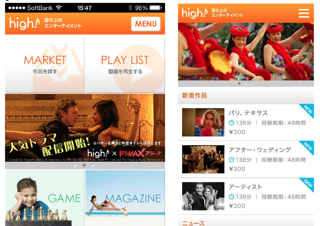 「high!」は、空港ターミナルの専用Wi-Fiより 映画やドラマのほか、音楽 番組、雑誌、ゲームなどさまざまなコンテンツをダウンロードし、 空港や機内で利用出来るサービス。