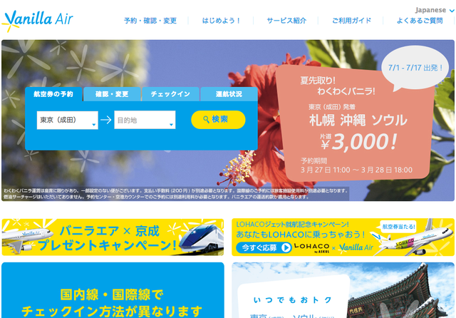 バニラエアは、2014年3月28日午後6時まで、東京/成田〜札幌/千歳・沖縄/那覇・ソウル/仁川線を対象に、特別運賃「わくわくバニラ」を発売している。