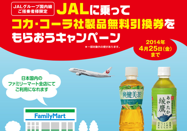 JALは、2014年4月3日〜25日に国内線に搭乗した人を対象に、機内でコカ・コーラ社製品の無料引換券を配布するキャンペーンを開催する。