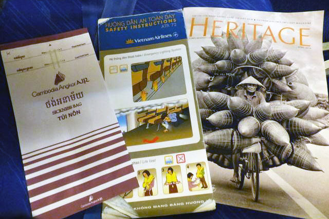 そして、シートポケットには、カンボジア・アンコール航空仕様のエチケット袋、ベトナム航空仕様の安全のしおりと機内誌が入っていました。
