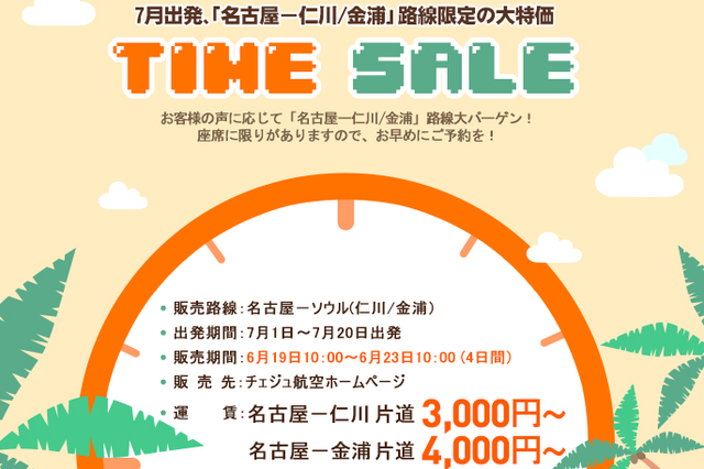 チェジュ航空(済州航空)は、名古屋/中部〜ソウル/仁川線でタイムセールを、6月23日午前10時まで開催している。