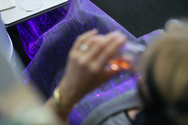 光ファイバーで編まれた「ハピネスブランケット」は、神経センサーを利用することで脳波をはかり、最もリラックスしてゆったりした状態になると、ブランケットの色が赤から青に変わる。