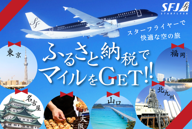 スターフライヤー(SFJ)は、福岡県行橋市へふるさと納税を申し込んだ人のお礼の品として、スターフライヤーのマイルやスターフライヤーオリジナルグッズの提供を開始すると発表した。