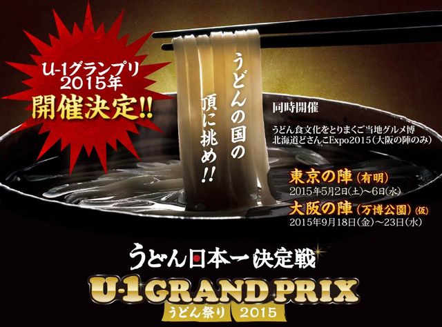 「U-1グランプリ」は、2013年より開催している人気イベント。うどんや出汁、食材などの関連業界や生産者の交流・活性化を促進し、地域社会に貢献するほか、世界が注目する” クールジャパン” と ” おもてなし” の国内外への発信、食育への貢献を目的としており、2014年に開催した東京大会は、入場者数20万人と大きく盛り上がった。2015年大会はさらにパワーアップし、うどんのみならず、うどん食文化をとりまく各種ご当地グルメも大集結。家族連れでも、おひとり様でも一日中楽しめる、ゴールデンウィーク中大注目のイべントとなっている。