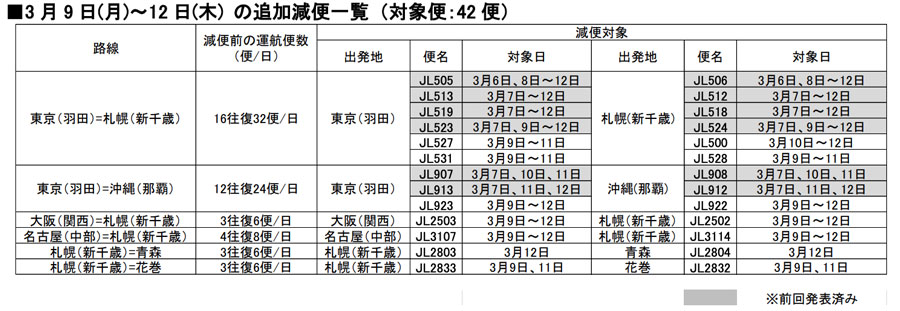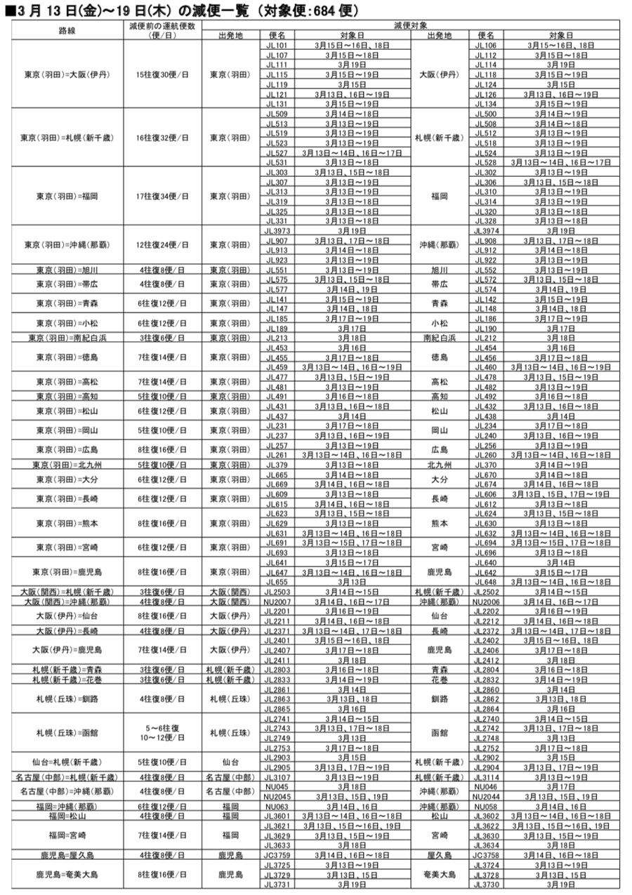国内線は、すでに発表している3月9日から12日までの減便をさらに42便追加する。また、3月13日から19日にかけても38路線の684便を減便する。
