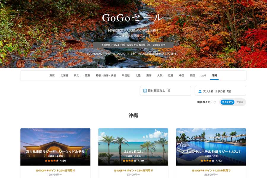 一休は、旅行予約サイト「一休.com」で、「GoGoセール」を10月24日正午から25日まで開催している。