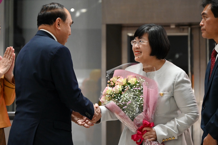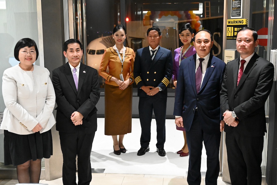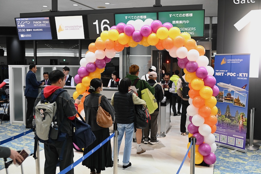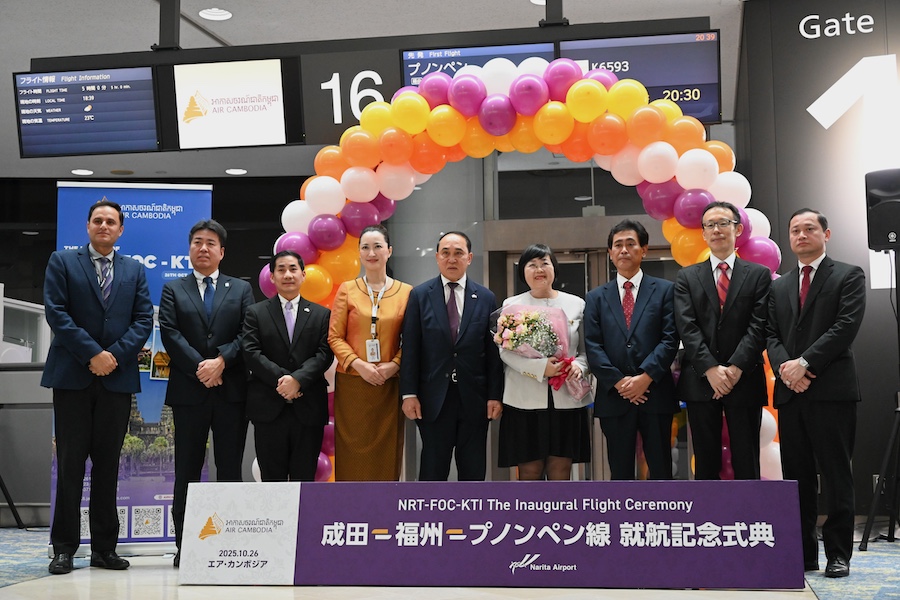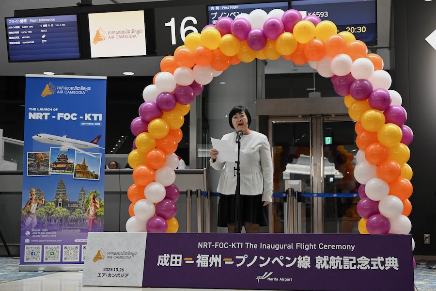 成田空港では開かれた記念式典では、カンボジア航空のウェンディ・チェン副CEOが、「この新路線は単なる都市間の交通手段ではなく、カンボジアと日本を結ぶ友情と文化、新たな機会の懸け橋だ」と話し、「私たちの飛行機は単に人を運ぶだけでなく、カンボジアのおもてなしの心、前向きな精神、文化への誇りを乗せている。安全で信頼される心のこもったサービスを提供することを約束する」とあいさつ。在日カンボジア大使館のトゥイ・リー特命全権大使が、チェン副CEOに花束を手渡して就航を歓迎した。