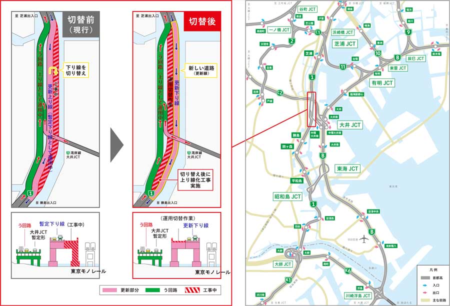 2026年春ごろの土・日曜に、上り線の走行ルートを迂回路から更新線に切り替えるため、下り線の通行止めを実施する。さらに、大井ジャンクション(JCT)接続分の切り替えも行う。