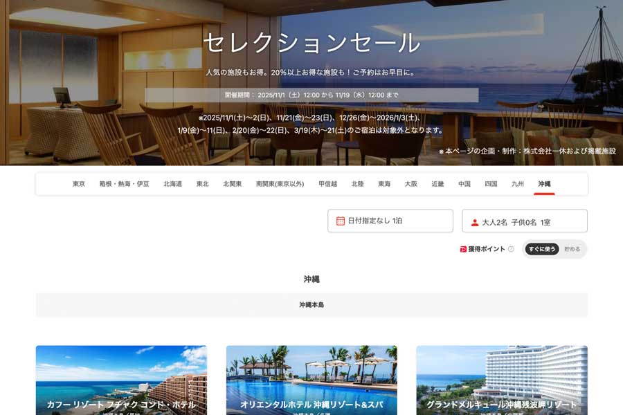 LINEヤフーは、旅行予約サイト「Yahoo!トラベル(ヤフートラベル)」で、「セレクションセール」を11月1日正午から19日正午まで開催している。