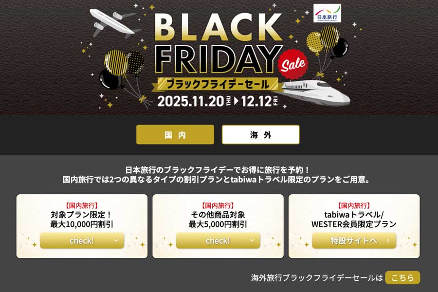 日本旅行は、「ブラックフライデーセール」を11月20日から12月12日まで開催する。
