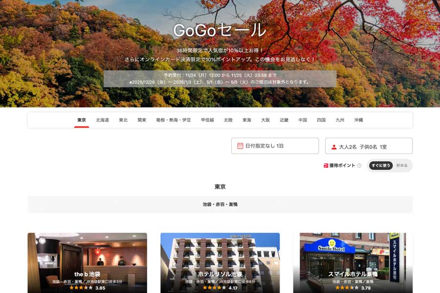 LINEヤフーは、旅行予約サイト「Yahoo!トラベル(ヤフートラベル)」で、「GoGoセール」を11月24日正午から25日まで開催している。