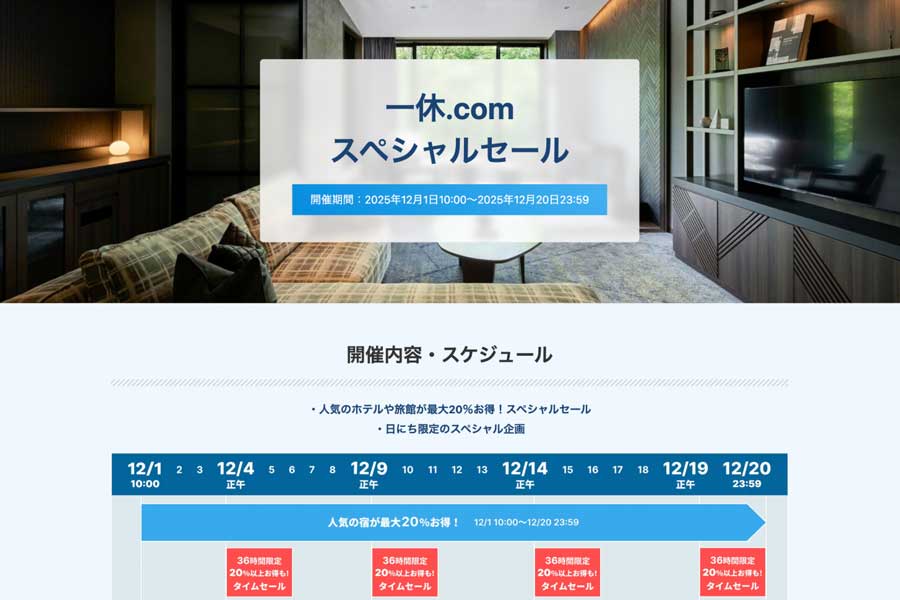 一休は、旅行予約サイト「一休.com」で、「一休.comスペシャルセール」を12月1日正午から20日まで開催している。