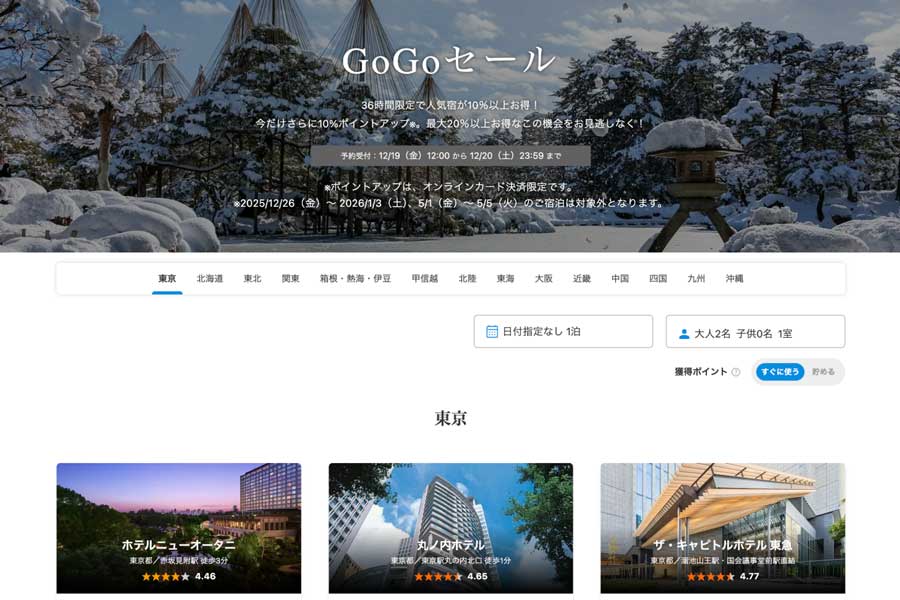 一休は、旅行予約サイト「一休.com」で、「GoGoセール」を12月19日正午から20日まで開催している。