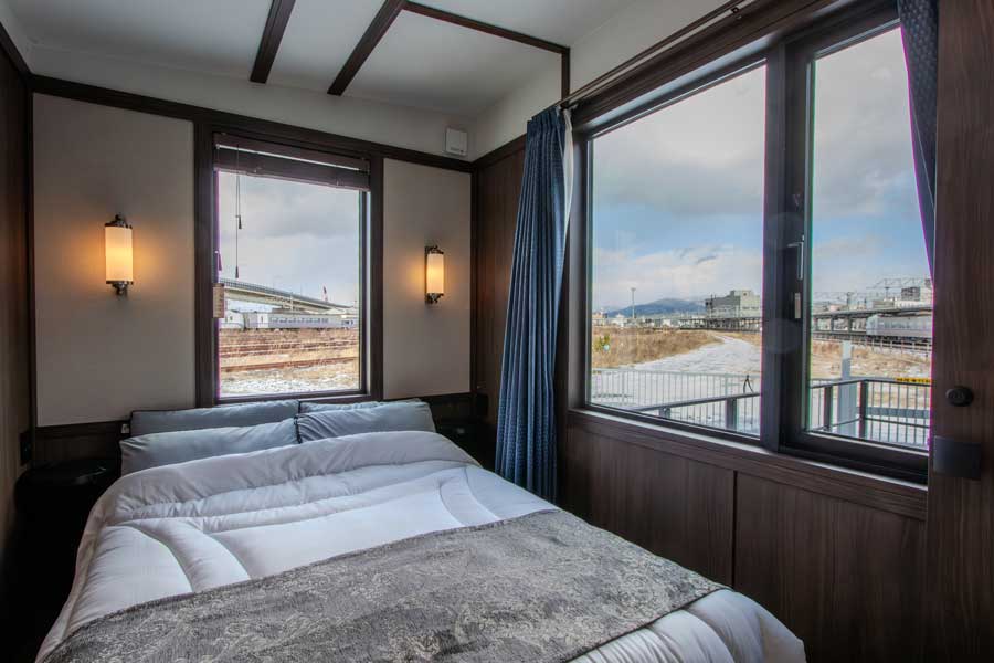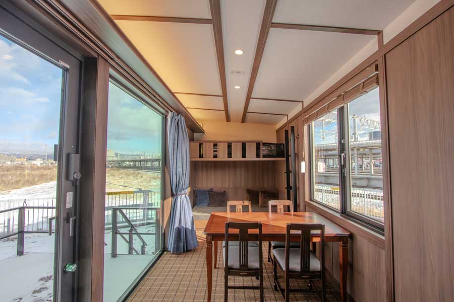 客室数はトレーラー10台構成で5室。客室面積は25.84平方メートルで、定員は4名。全室のウッドテラスからは停車中の車両や転車台を眺められる「トレインビュー」となる。室内の内装は深みのある色合いの木目調を基調に、アンティーク調の装飾照明を取り入れ、函館らしいクラシックでモダンな空間を創出している。ゆったりとした寝室、バンクベッドを配したリビングルーム、シャワールーム、トイレを完備する。室外にはウッドテラスを設ける。