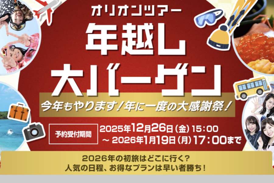 オリオンツアーは、「オリオンツアー年越し大バーゲン」を12月26日午後3時から2026年1月19日午後5時まで開催している。