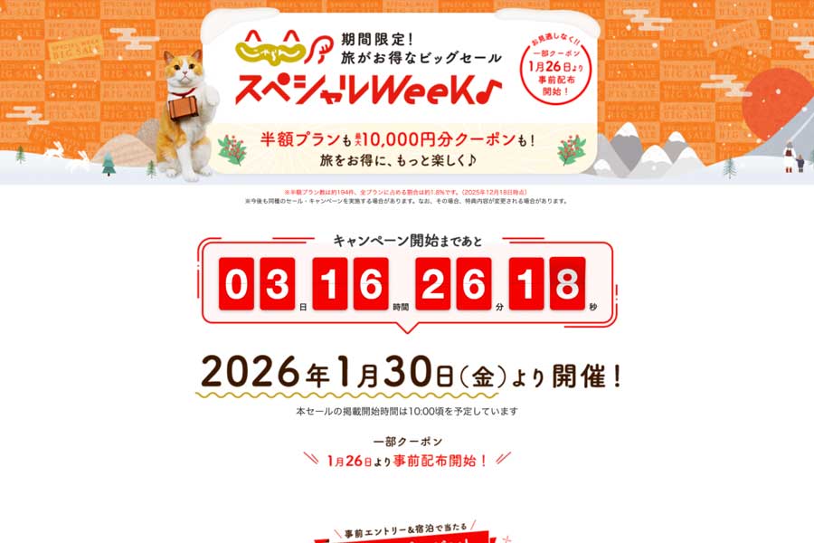 リクルートは、旅行予約サイト「じゃらんnet」で「じゃらんスペシャルウィーク」を、1月30日午前10時から2月19日まで開催する。