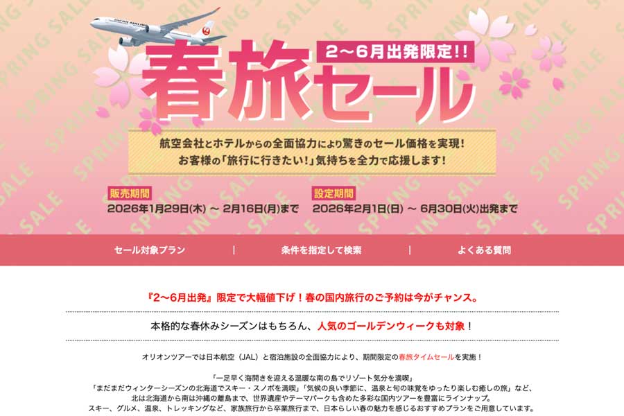 オリオンツアーは、「春旅セール」を1月29日午前11時から2月16日午後11時半まで開催している。