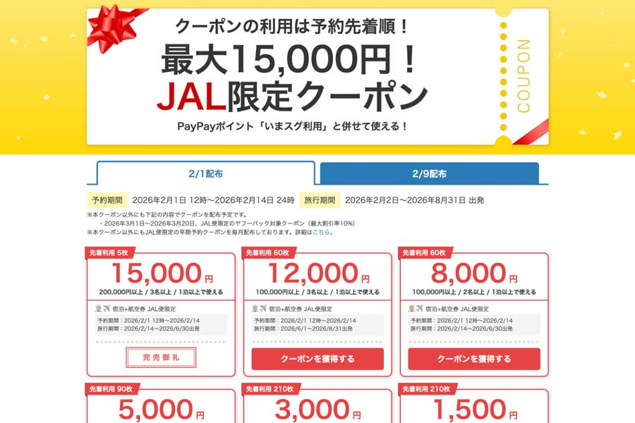 日本航空(JAL)の航空券とホテルのセットプラン「ヤフーパック」が対象で、利用額に応じて最大5,000円を割り引くクーポンを配布する。2月9日にも追加配布する。