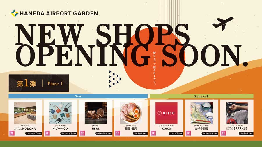 新たに新店舗として、京都のラーメン人気店「麺屋 優光」、手作りの鞄工房「HERZ(ヘルツ)」、バッグや革小物を扱う「MOTHERHOUSE(マザーハウス)」、カフェラウンジ「エアポートカフェラウンジNODOKA」をオープンする。また、「OJICO」、「吉祥寺菊屋」、「T-shirts & Souvenirs SPARKLE」はリニューアルオープンする。