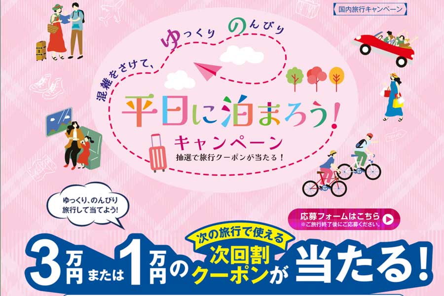 JATA会員各社で、1人1万円以上の平日宿泊を含む旅行を購入した人を対象に、抽選で次回の旅行で利用できるクーポンをプレゼントする。応募期間は4期に分けられており、4月、7月、10月、2027年1月からいずれも3か月間。各期間、旅行券3万円分と1万円分をそれぞれ20名にプレゼントする。