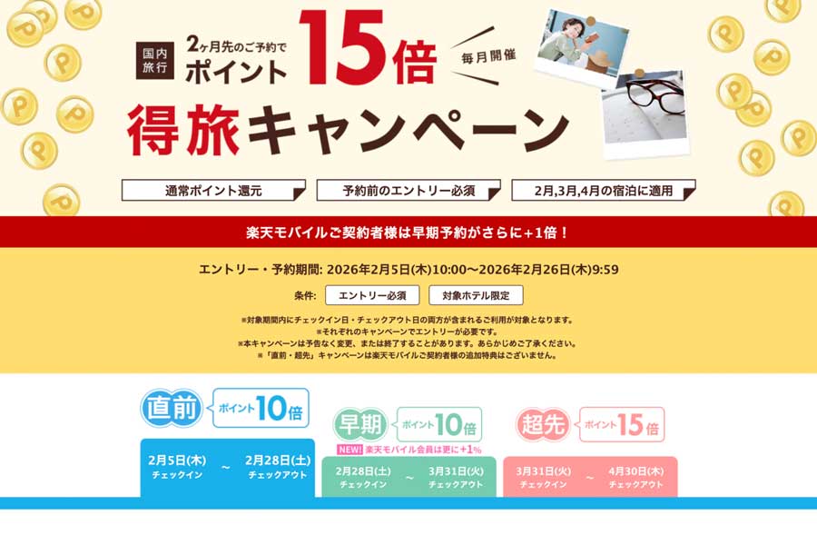 楽天グループは、旅行予約サイト「楽天トラベル」での国内宿泊で楽天ポイントを最大15倍付与する「得旅キャンペーン」を開催する。