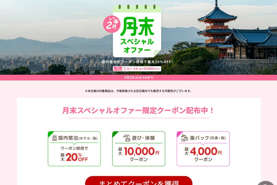 楽天トラベル、「月末スペシャルオファー」開催 3月2日まで