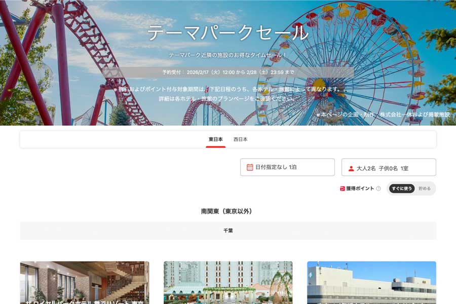 LINEヤフーは、旅行予約サイト「Yahoo!トラベル(ヤフートラベル)」で、「テーマパークセール」を2月17日正午から28日まで開催している。