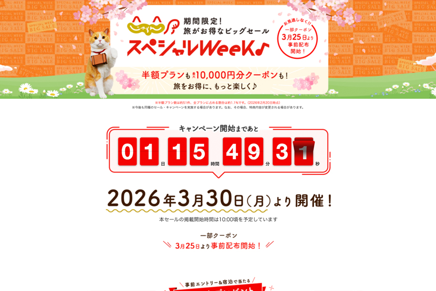 リクルートは、旅行予約サイト「じゃらんnet」で「じゃらんスペシャルウィーク」を、3月30日午前10時から4月17日まで開催する。