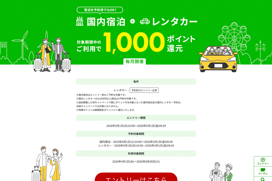 楽天トラベル、国内宿泊とレンタカーの予約・利用者に1,000ポイント還元