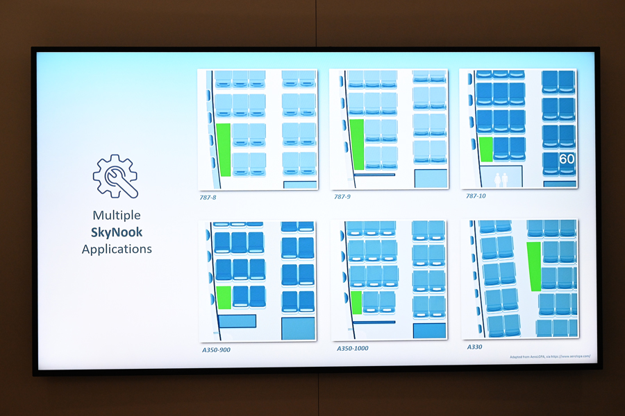 担当者は、「スカイヌックが注力しているのは、ここに座っている乗客にとってこの空間をいかにして機会に変えるか、そしてさらに重要なことに、航空会社が客室構成のソリューションとして活用できる機会にするにはどうすればよいか、ということ」と話した。