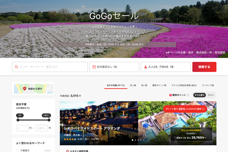 LINEヤフーは、旅行予約サイト「Yahoo!トラベル(ヤフートラベル)」で、「GoGoセール」を4月19日正午から20日まで開催している。