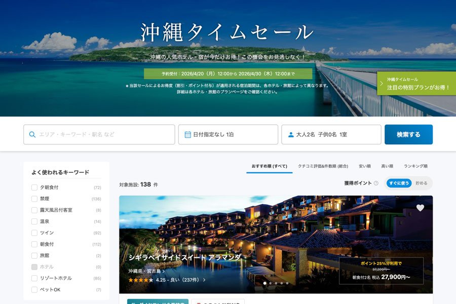 一休は、旅行予約サイト「一休.com」で、「沖縄タイムセール」を4月20日正午から30日正午まで開催している。