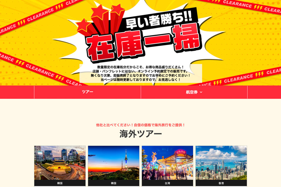エイチ・アイ・エス(HIS)は、関西発着の海外ツアー・国内ツアーを対象に「在庫一掃セール」を開催している。