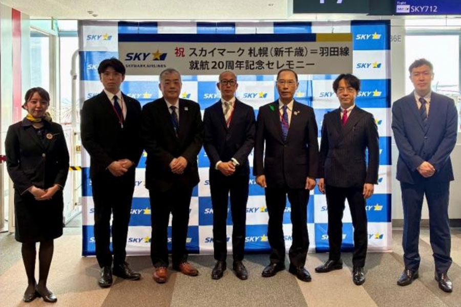 スカイマークは、東京/羽田〜札幌/千歳線が就航20周年を迎えたことを記念し、4月27日に新千歳空港で記念セレモニーを開催した。