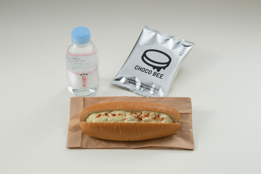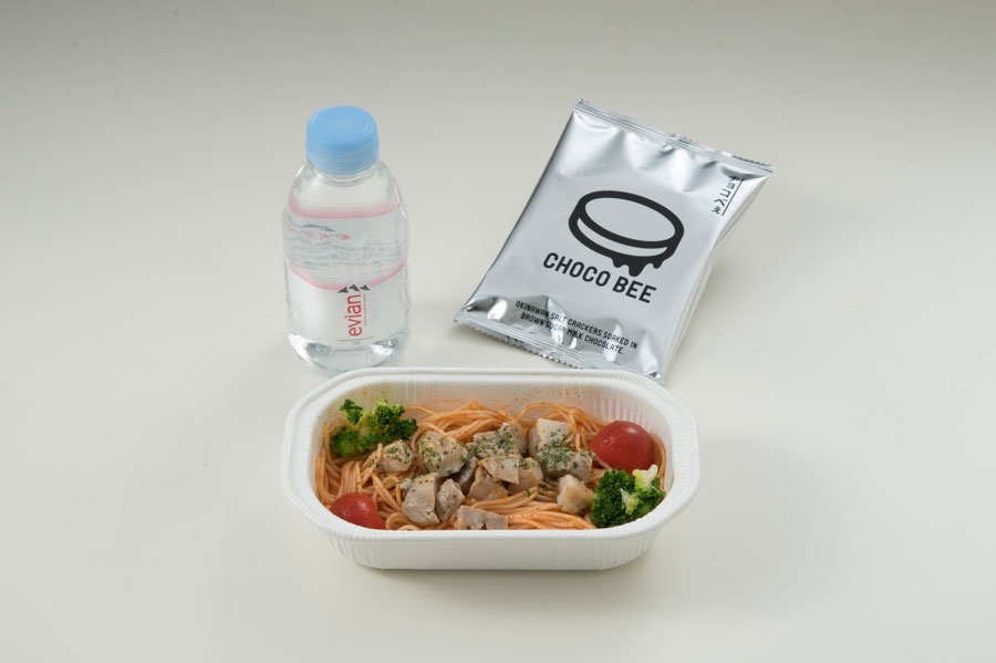 エコノミークラスでは、沖縄/那覇発はチーズツナサラダロールとアップルジュースのセット、台北/桃園発は沖縄の老舗洋菓子店「ジミー」のプレーンマフィンとアップルジュースのセットを提供する。